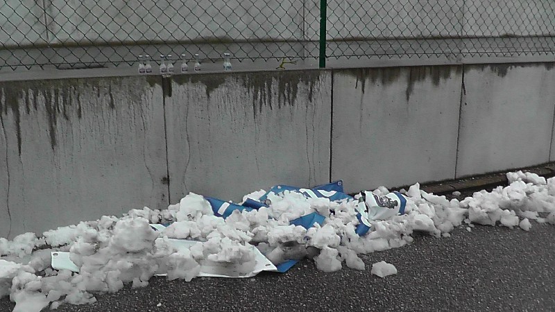 An dieser Stelle war die Werbeplan ursprünglich angebracht. Man kann sehr gut die verbogene Stange erkennen. Es braucht sehr viel Kraft und Zerstörungswut, um diese massive Eisenstange so zu verbiegen.
